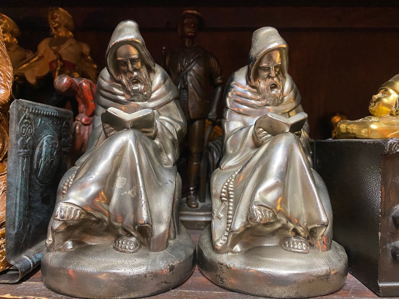 As a birthday gift to myself last year, I bought a pair of antique bookends—twin hooded monks with pointed beards and a book in hand. The rosary draped over his leg tells you he’s a monk, but the rest of the imagery suggests he’s a kind of wizard or a humble hermit. The latter is the fantasy I choose to believe. The Hermits are, in a way, a physical reminder of my personal goals. To read deeply, widely, and for myself—to be immersed in what I love doing and to make it a regular part of my life.